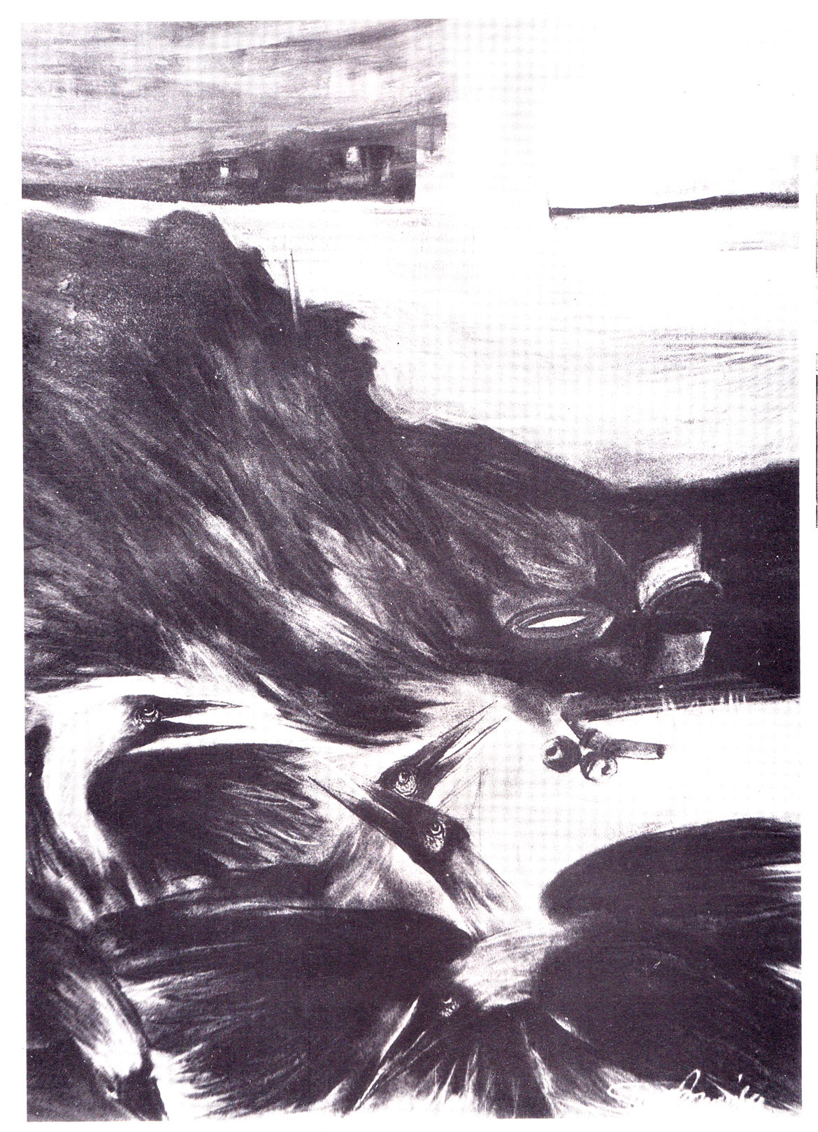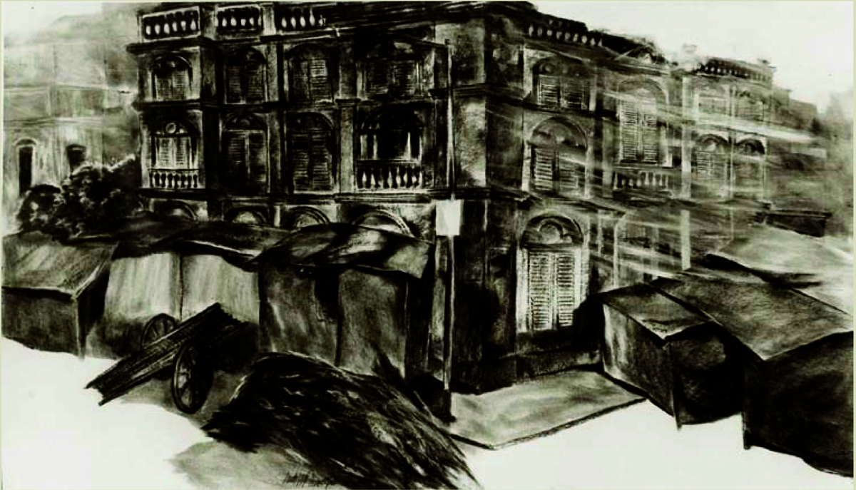 The same aura is reinforced in the empty rooftops of a city where the ubiquitous crows perch on parapets and wires. The artist avers that in Calcutta one cannot ignore the crow. Intricately etched lines of these birds with unruffled feathers and pugnacious expressions contain layers of signifiers. In the trajectory of his life as an artist activist, Shuvaprasanna relationship with the metropolis he inhabited was intimate and deep. As a young man, the city appealed to his aesthetic senses, with its sudden vistas of green amidst the dull stretches of endless streets and buildings. From the tram car, as it trundled past the Maidan, he glimpsed the monument towering overhead and the multitudes of people below, a giant patchwork of colours and activities, then, in the distance, he spied the regal fade of the Grand Hotel, standing just a little apart, reluctant almost to be part of the hustle bustle around.