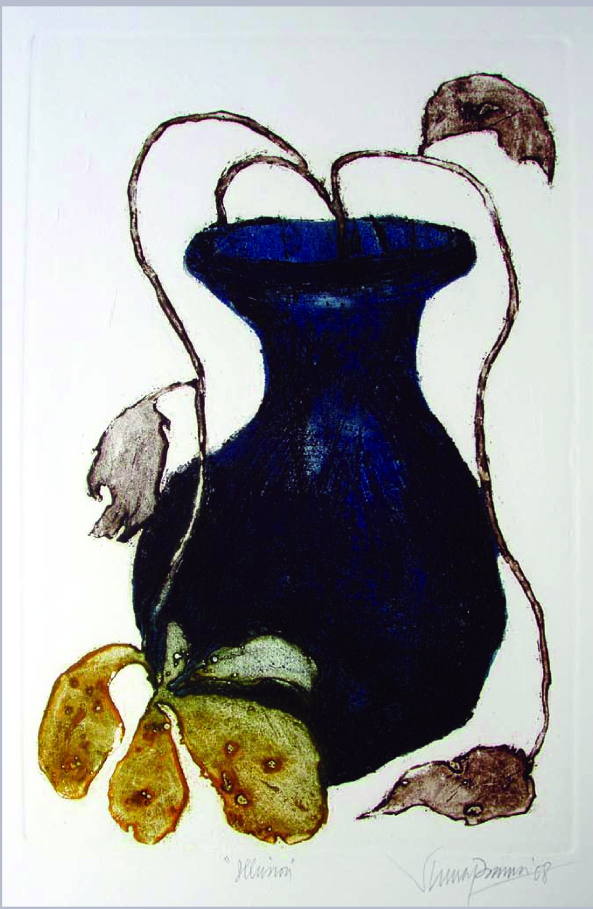 A predominance of black and white and sepia or burnt amber in his incredible series of paintings in charcoal and acrylic, that marked the Calcutta Tercentenary year, is described by the artist as my journalistic view of the city of my birth and life The city urban milieu, its gloom, daily struggles and cultural ethos continued to be depicted evocatively in graphic prints and other work of the 1970s and 1980s that includes Illusion, Abode and Lament. Expressions of dismay overlaid with a touch of hope in the culture and squalour of Calcutta, the city survival instinct despite its decay, is featured through a fusion of symbols and images. likes to work in series. Working in series allows me to reflect over a passage of time and develop an idea.